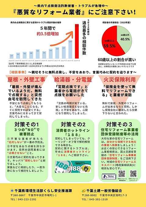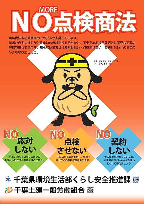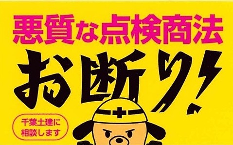 地域のみなさま すまいるちば(リフォームや住宅相談) 地域の建設職人が責任をもって相談から施工まで対応します。 ↑ すまいるちばホームページへ ↑ 悪質な点検商法に注意してください 千葉土建では千葉県に協賛いただき、点検商法注意喚起のチラシを作成しております。 下記よりチラシがダウンロードできますので、が活用ください。 ポストや玄関に貼れる 点検商法お断りステッカーを お配りしております。 ご希望の方は 千葉土建八街支部まで お越しください。 ↓ ↓ ↓ ↓